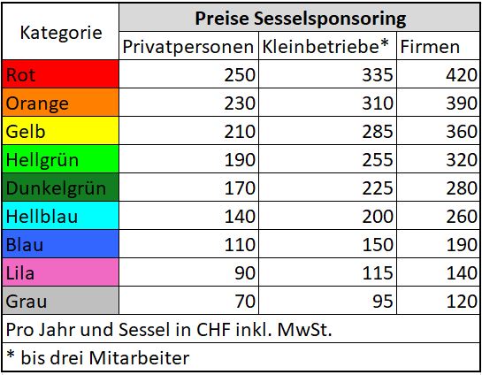 Der nachfolgende Saalplan zeigt die Preiskategorien nach Farbe an. Der Unterschied zu einem Gönnerbeitrag ist der, dass Sie ebenfalls zu den jährlichen Sponsoren-Anlässen mit Überraschungsfilm und Apéro eingeladen werden.